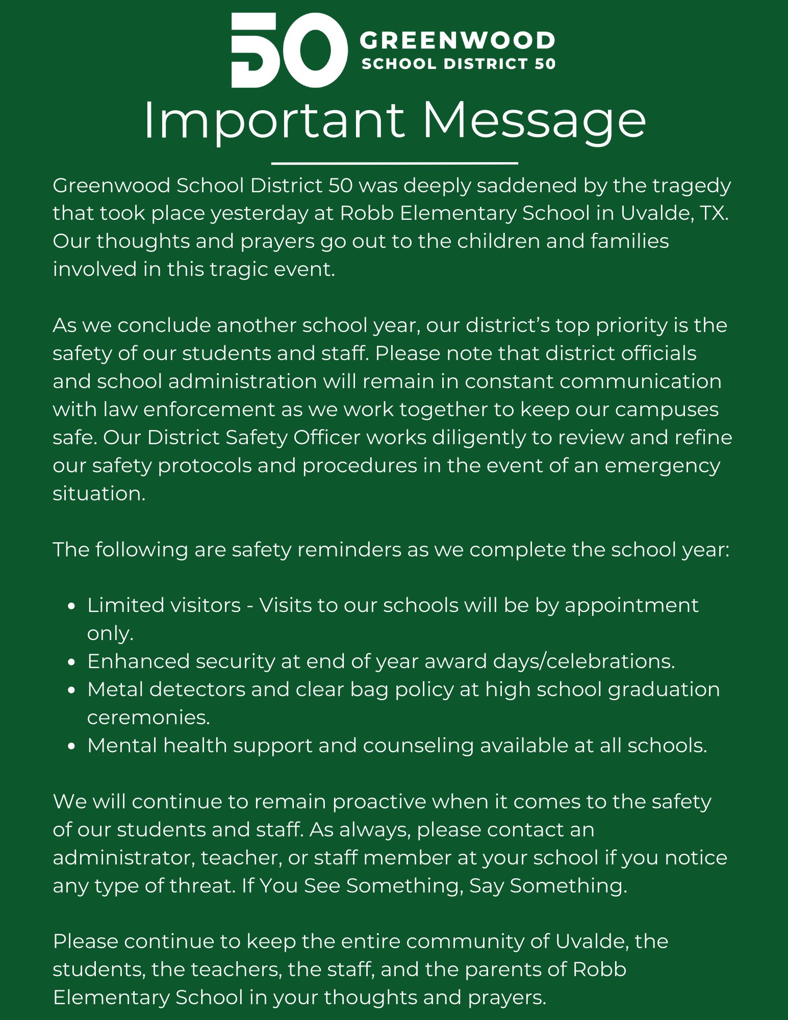 Greenwood 50 Schools V Twitter Superintendent Dr Glenn Offers School Safety Message And Reminders In The Wake Of The Tragedy In Texas Https T Co Fnardtzg1o Twitter